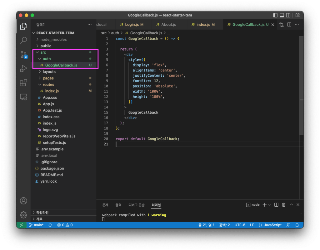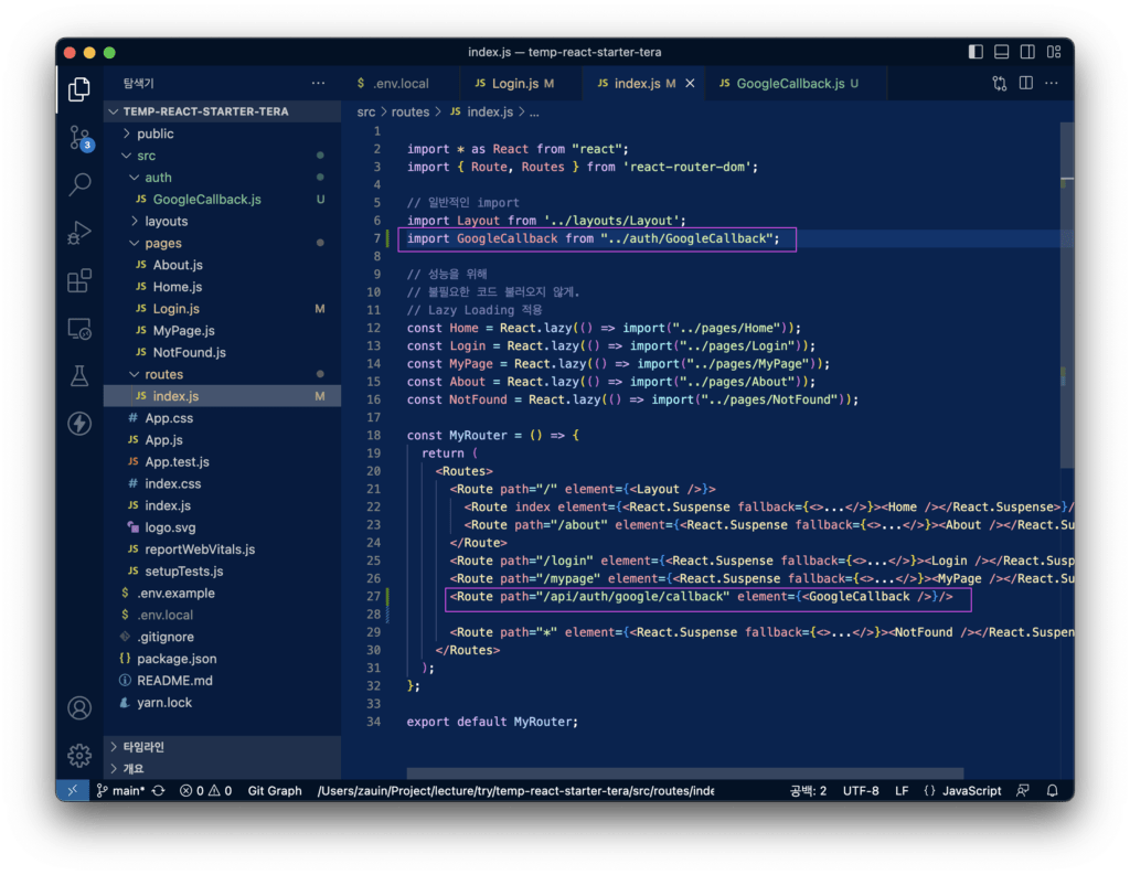/api/auth/google/callback 에 해당하는 페이지를 만들고, 옆의 url(1)이 리액트파일(2)을 잘 따라가도록 Routing 해 주려고 합니다.