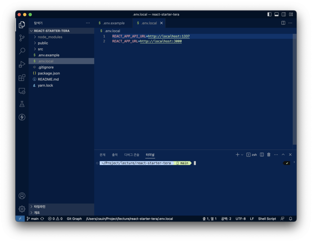 .env.local 파일은 서버를 재시작 해야 반영이 됩니다. CtrI+C를 눌러 프론트엔드를 종료하고 다시 yarn start로 프론트를 실행합니다.