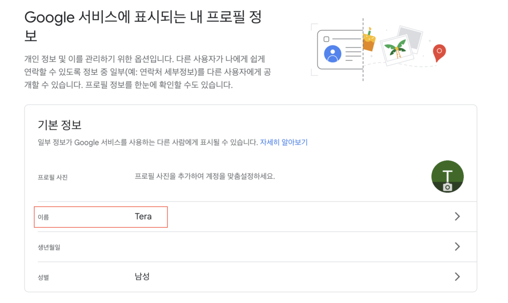 즉, 예를 들면, teracokr@gmail.com 이라는 계정의 구글 사용자 이름은 Tera입니다.